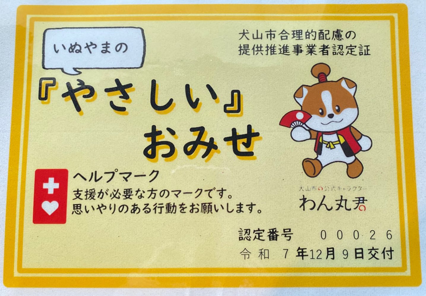 犬山市認定「やさしいお店」に選ばれました